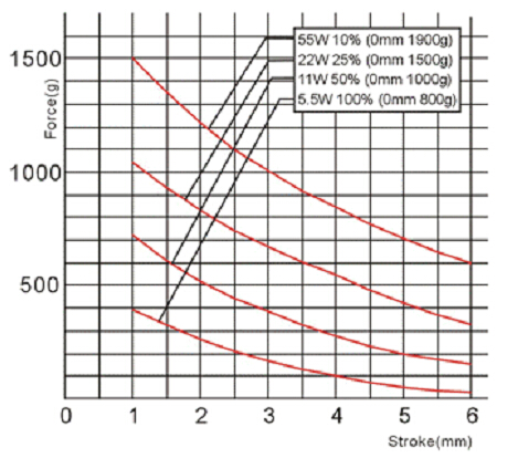縱向:代表電磁鐵在對應行程時的力量   單位為克(g)