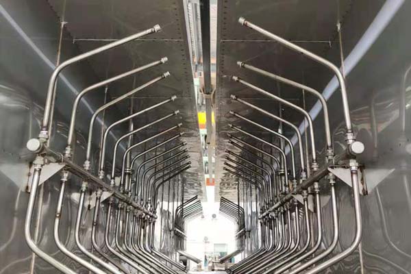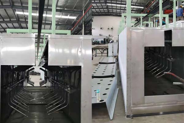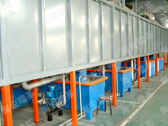 前處理生產線結構特點是:前處理生產線各工序噴淋管布置在隧道內,噴淋由各液槽的泵來提供.各工序間都有門洞板隔開,以防竄液.各加熱液槽的加熱形式有槽內和槽外。內加熱器有排管、蛇形管、波紋板等;外加熱器有列管、板式加熱器等。加熱介質有熱水 、蒸汽、導熱油等。在脫脂、磷化工序分別設有除油系統和除渣系統。為防止各加熱段隧道頂部及門洞處溢出蒸汽,在隧道頂部設有排風機。
